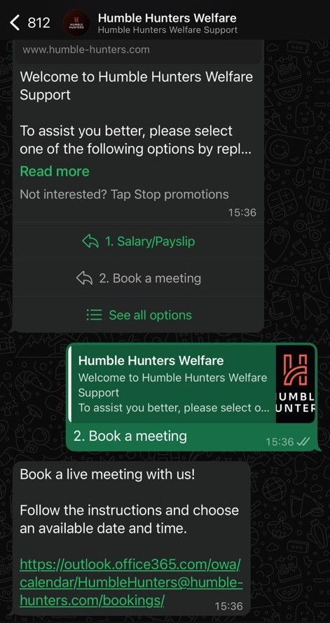 - Kandidat iz Filipina posjeti web stranicu Humble Huntersa i postavi pitanje na WhatsAppu: “Koje dokumente trebam za radnu dozvolu?”